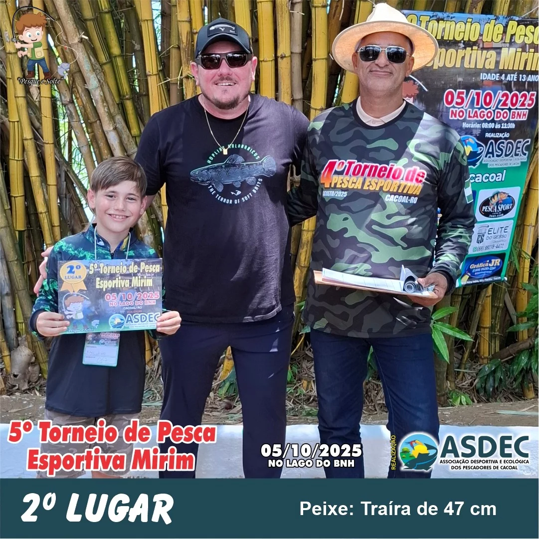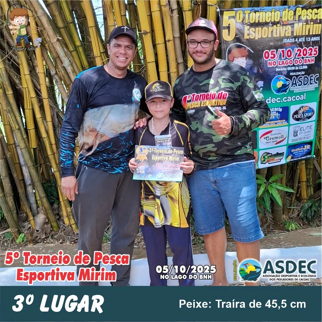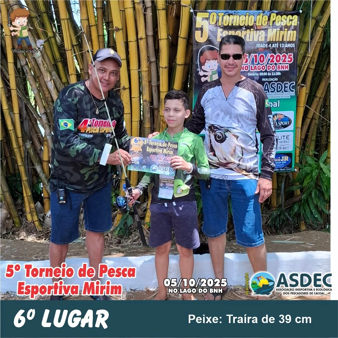 Das 8h às 11h30, os pequenos pescadores mostraram habilidade e concentração em uma disputa marcada pelo equilíbrio técnico. A diferença entre o primeiro e o sexto colocado foi de apenas 9 centímetros, evidenciando o alto nível dos participantes. Luis Hamilton conquistou o primeiro lugar ao fisgar uma traíra de 48 cm, enquanto Felipe Melo, sexto colocado, registrou 39 cm.