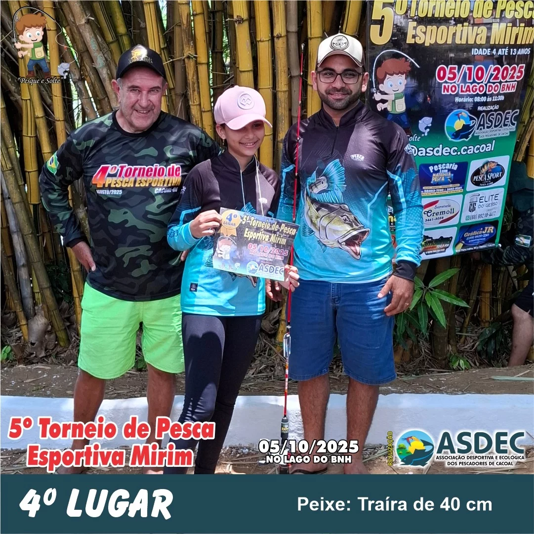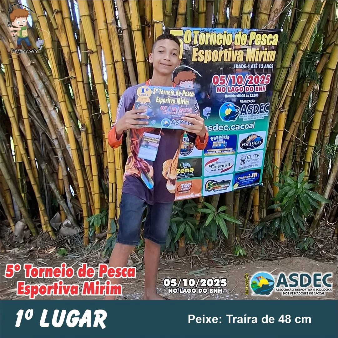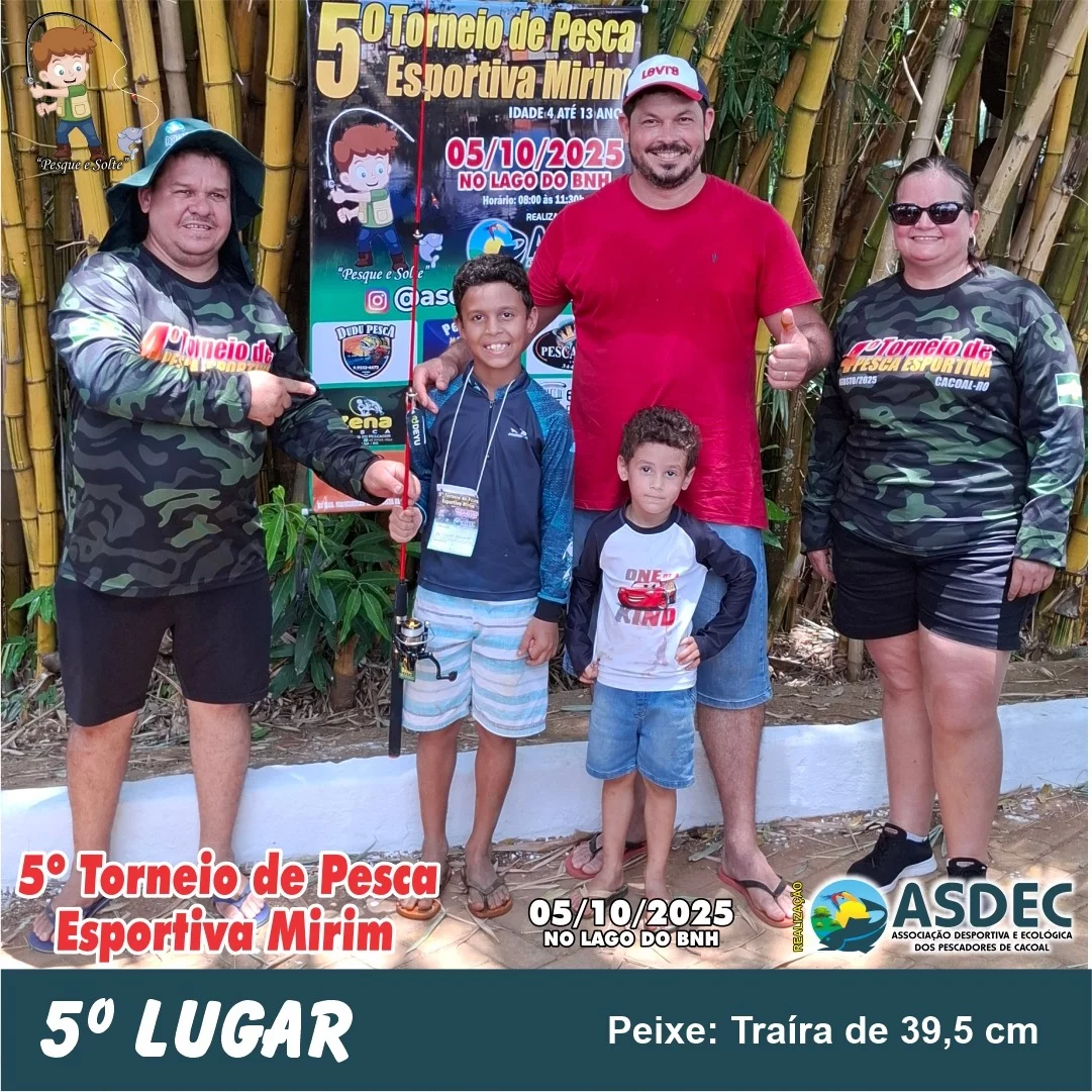 Das 8h às 11h30, os pequenos pescadores mostraram habilidade e concentração em uma disputa marcada pelo equilíbrio técnico. A diferença entre o primeiro e o sexto colocado foi de apenas 9 centímetros, evidenciando o alto nível dos participantes. Luis Hamilton conquistou o primeiro lugar ao fisgar uma traíra de 48 cm, enquanto Felipe Melo, sexto colocado, registrou 39 cm.