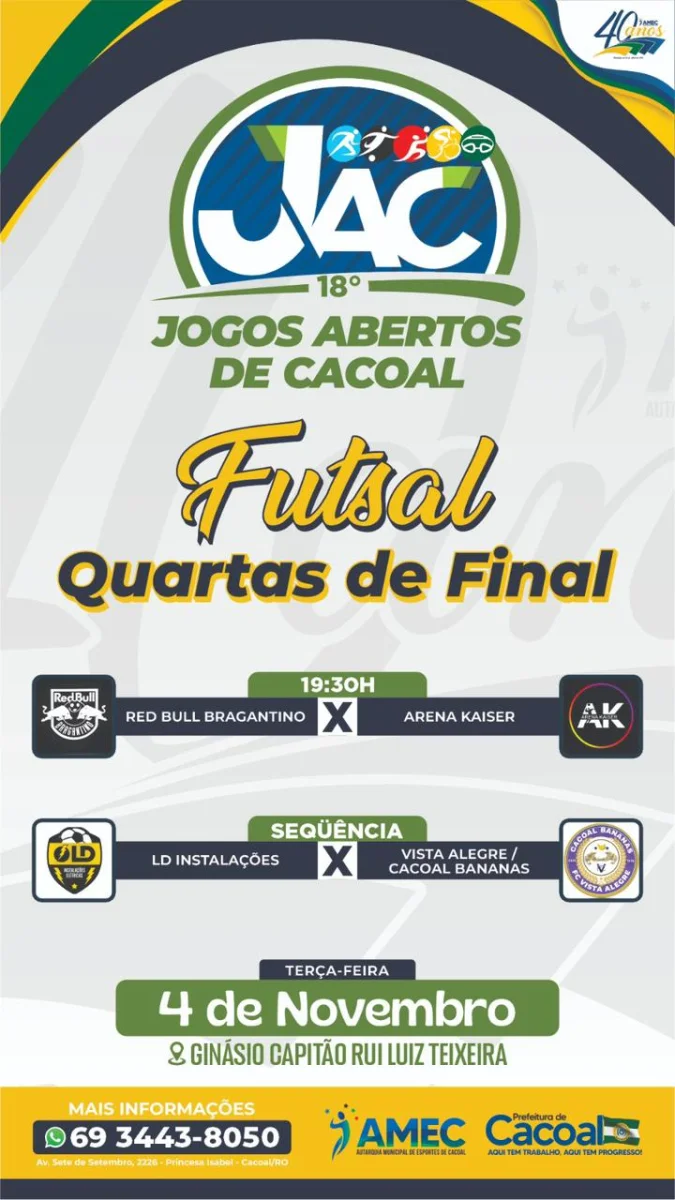 – As quartas de final do futsal masculino dos 18º Jogos Abertos de Cacoal (JAC) serão disputadas nesta terça-feira (4 de novembro), no Ginásio Capitão Rui Luiz Teixeira, em Cacoal. As partidas prometem equilíbrio e emoção entre as equipes que buscam vaga nas semifinais da competição.