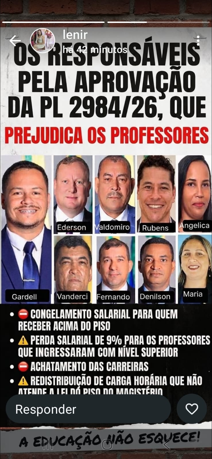 A mobilização ganhou força com a divulgação de uma imagem que vem sendo amplamente compartilhada na internet. O material reúne fotos de vereadores da cidade e associa a atuação dos parlamentares à aprovação da proposta, sob o lema “A educação não esquece!”, em um claro sinal de cobrança política.